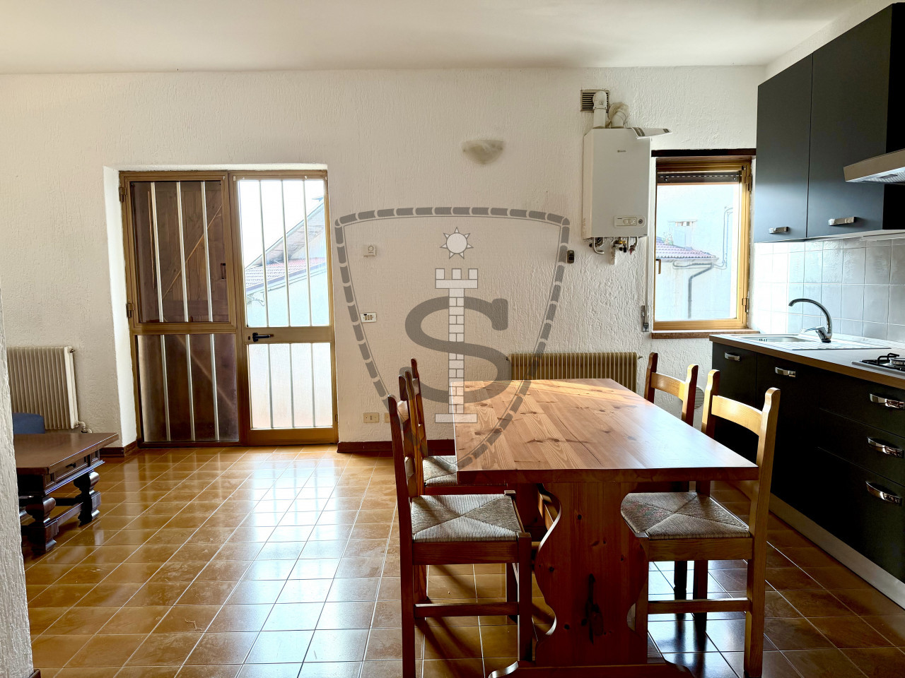 L'accesso all'abitazione avviene tramite un ingresso indipendente al piano primo, preceduto da una terrazza. Internamente, l'appartamento si sviluppa con una cucina-soggiorno, esposta a sud, che garantisce un'ottima illuminazione naturale. Un disimpegno collega gli spazi notte, composti da una camera matrimoniale, una camera singola e un bagno dotato di vasca.
